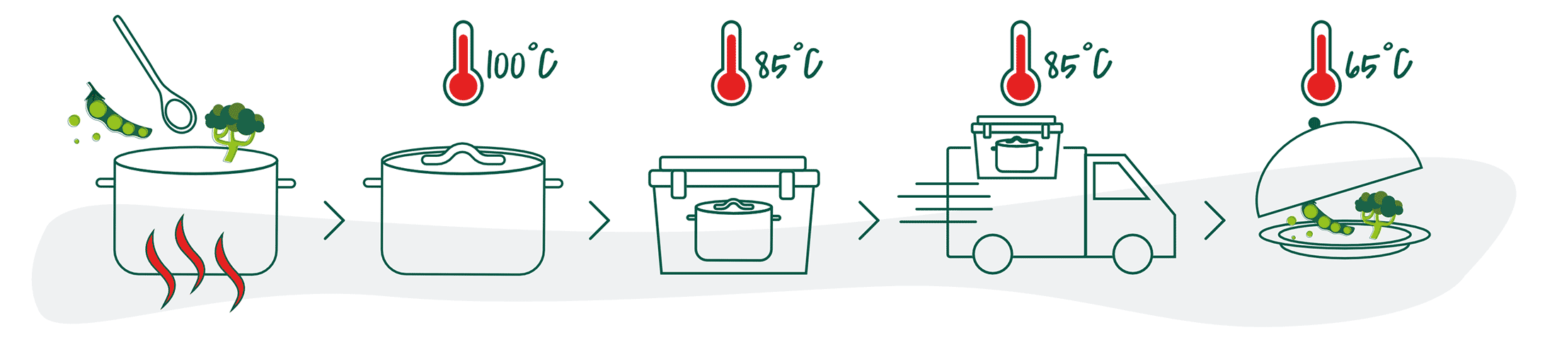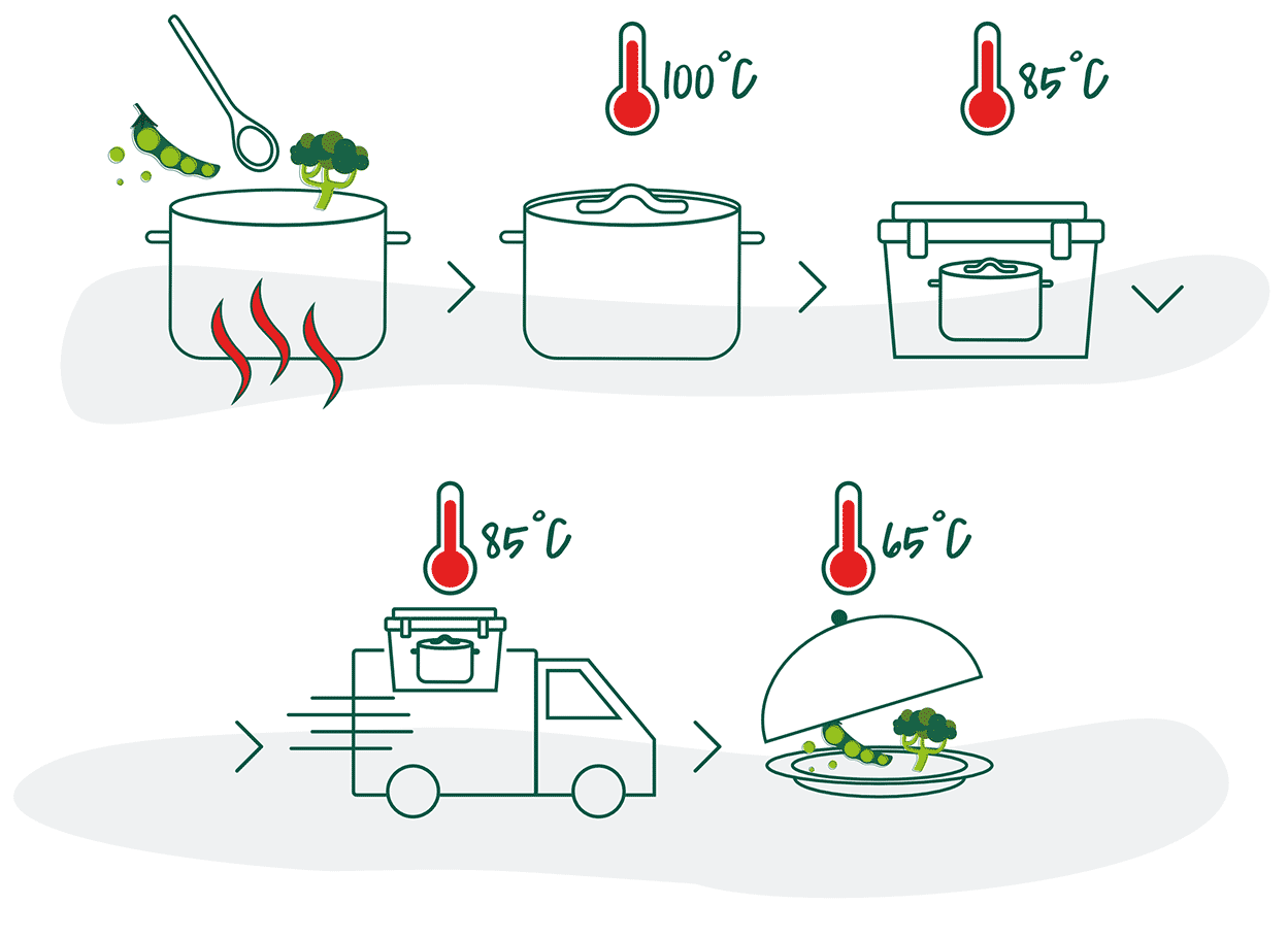 Beim Cook & Hold-Verfahren werden die Speisen morgens frisch zubereitet, auf Serviertemperatur gebracht und anschließend in isolierten Thermobehältern sicher zur Einrichtung transportiert. Dort stehen sie – ohne zusätzliches Erhitzen – direkt zur Ausgabe bereit.